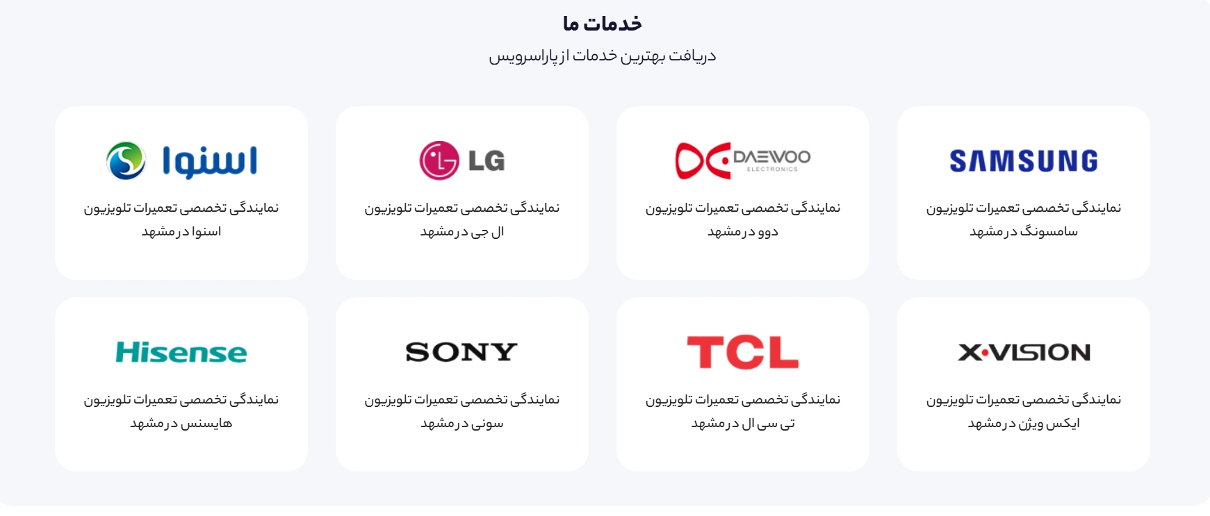 | خدمات فنی توس سرویس | 09335899017 | https://toosservice.ir | مشهد – اندیشه 8 – پلاک 75 |